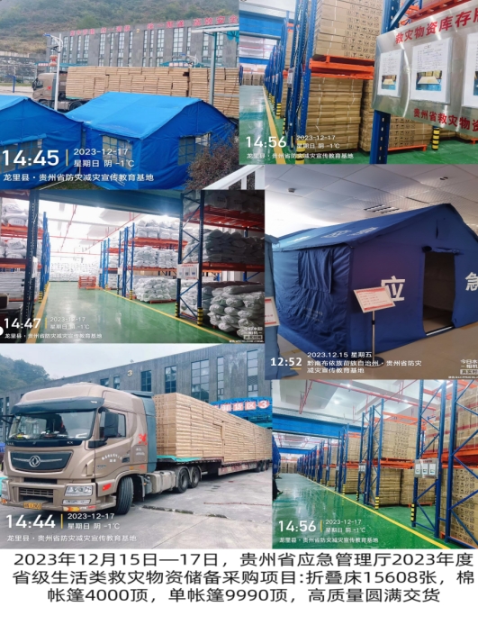 2023年12月15日-17日,贵州省应急管理厅2023年度省级生活类救灾物资储备采购项目:折叠床15608张,棉帐篷4000顶,单帐篷9990顶,高质量圆满交货